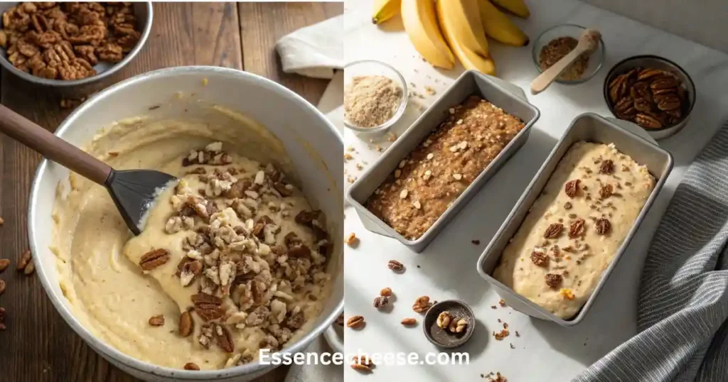 - Add bananas, nuts, and vanilla: Stir in mashed bananas, chopped nuts, and vanilla extract. Divide batter evenly into prepared pans.