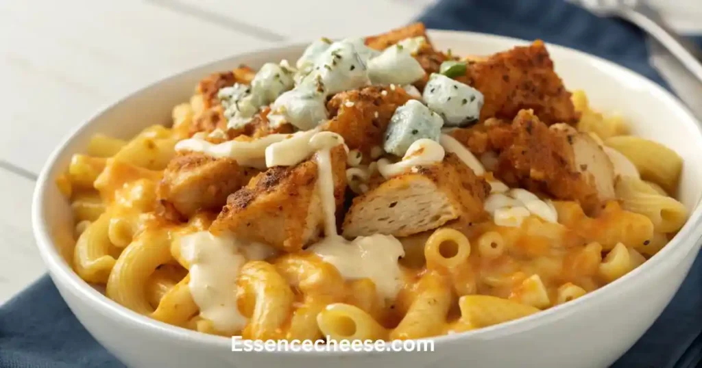 Bring game-day flavor to your mac n cheese bar. Guests can load up their bowls with spicy chicken, tangy sauces, and crunchy toppings that echo the taste of classic wings.